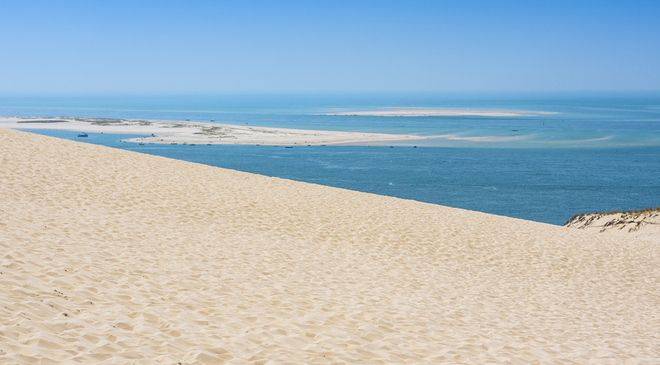 La Dune du Pilat est la plus grande dune naturelle d'Europe : grimpez au sommet et découvrez un océan de verdure côté terre, et l'Atlantique à perte de vue côté mer, avec la pointe du Cap Ferret et les bancs de sable blanc.